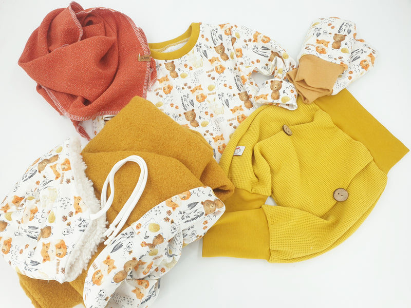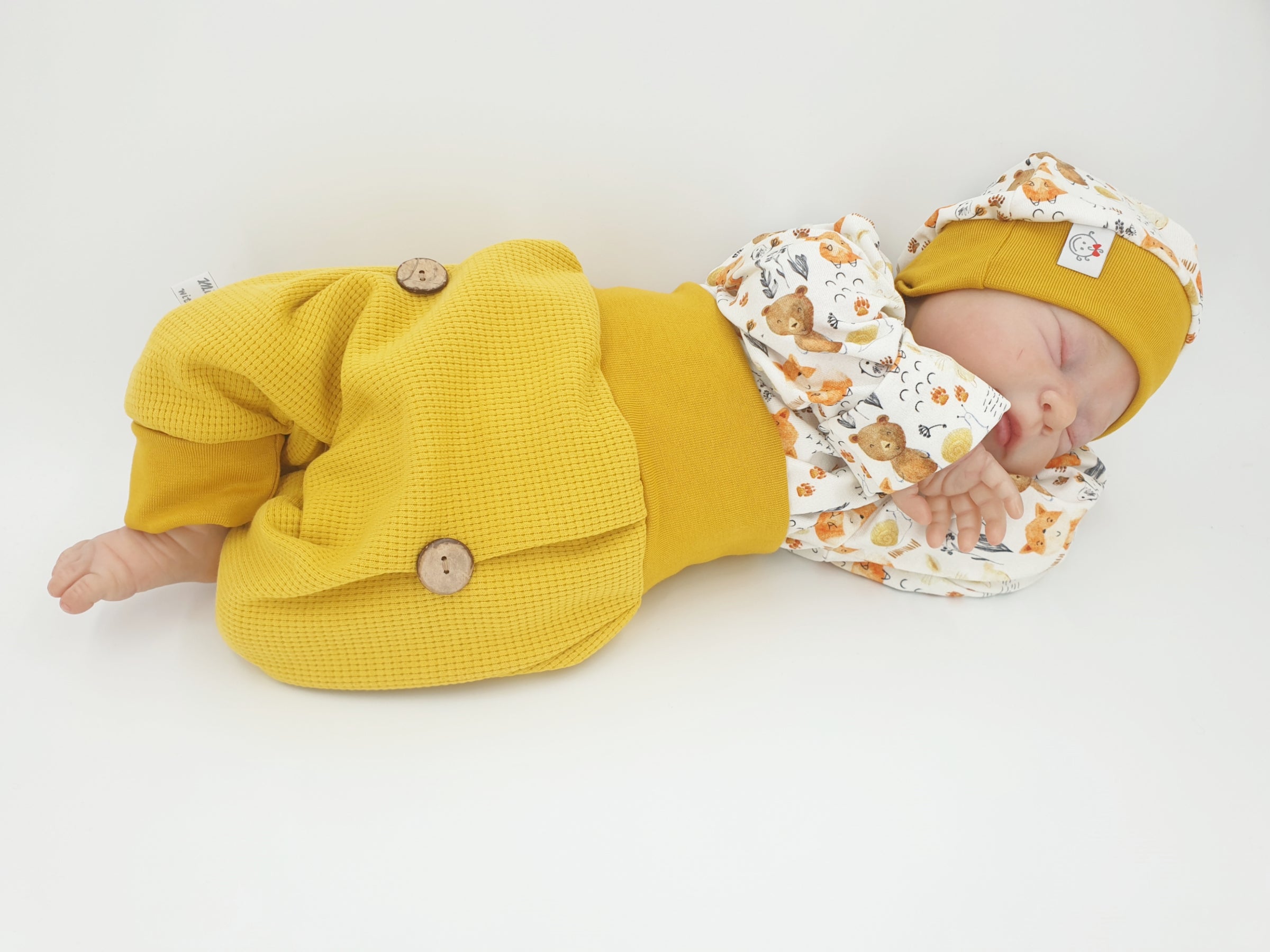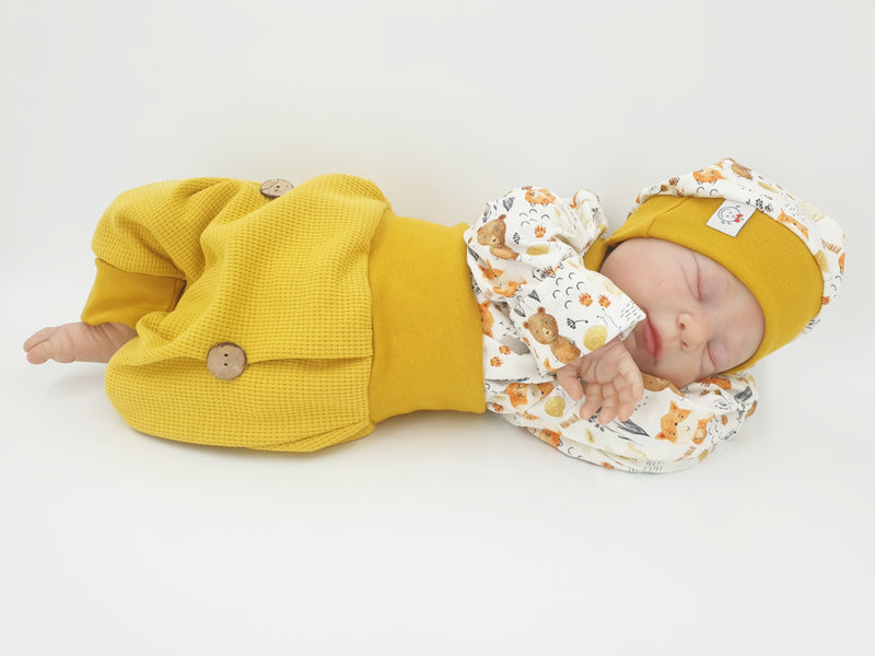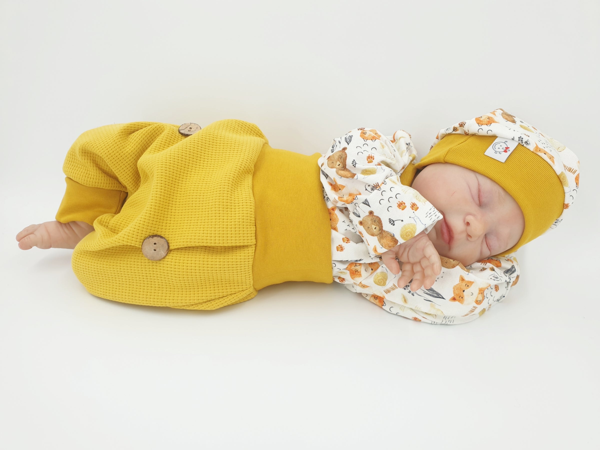 Coole Pumphose oder Babyset Knopfhose Waffeljersey senfgelb 116 von Atelier MiaMia