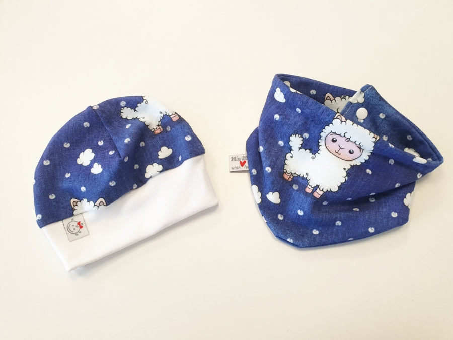 Beanie Set Mütze und Tuch Baby Schafe blau Nr. 251 von Atelier MiaMia