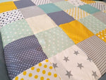 Kuscheldecke Patchwork Punkte Sterne Gelb Türkis mit Stickerei 5 von Atelier MiaMia