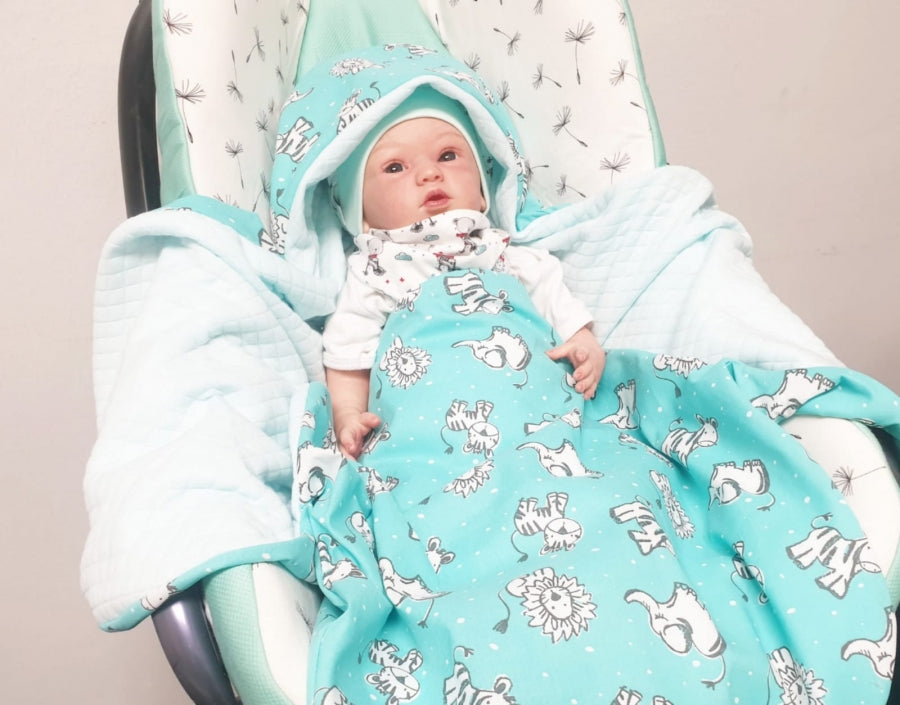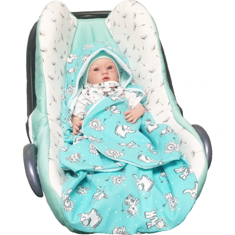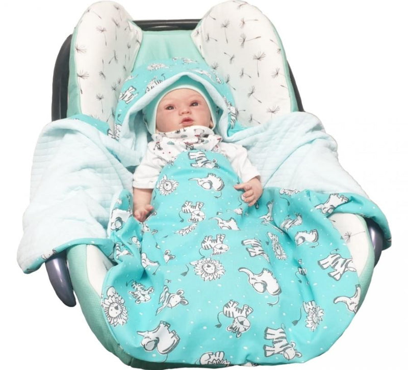 Alternative zum Babyschalenfußsack, tille Einschlagdecke für die Babyschale sie passt auf jede Babyschale. In der Einschlagdecke ist ein Schlitz zum einführen des mittigen Anschnallers, die anderen Gurte werden außerhalb der Decke geführt zum anschnallen.