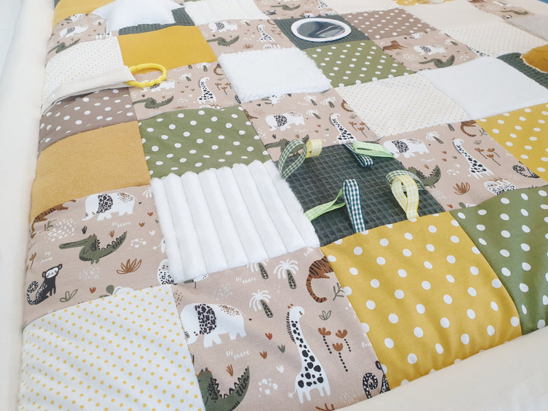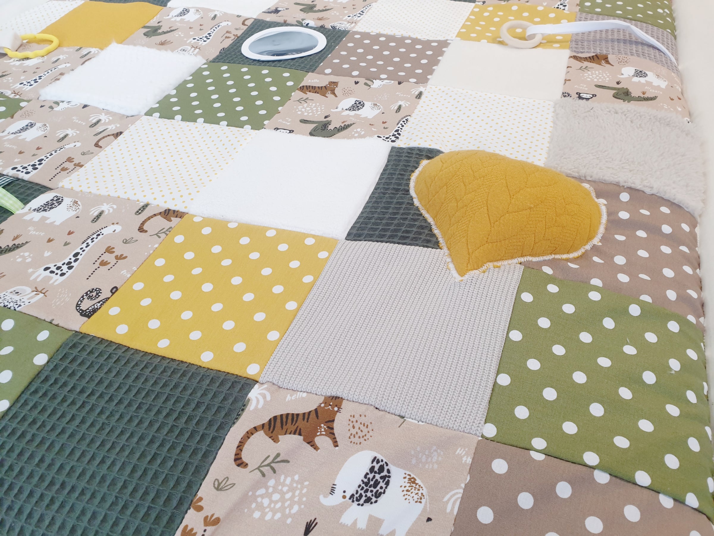 La normale coperta avventura viene fornita con molti colori vivaci, anche con tessuti desiderati (www.schwanger.name), diverse aree sensoriali come. Velluto a coste, peluche, corda, ecc., campo scoppiettante, nastro con anello di dentizione (può essere rimosso e qualcos'altro attaccato), sonaglio, squeaker, campo con linguetta, anello di legno, campo in velcro. La spessa imbottitura lo rende ideale per il pavimento.