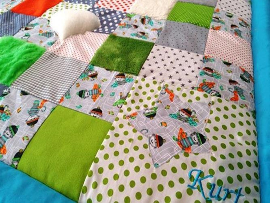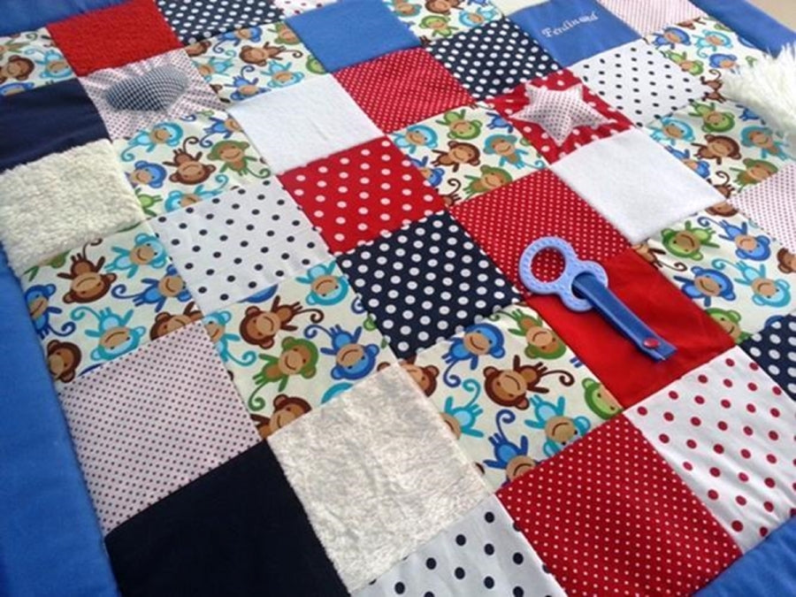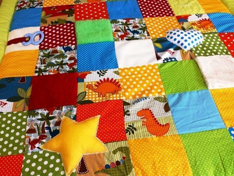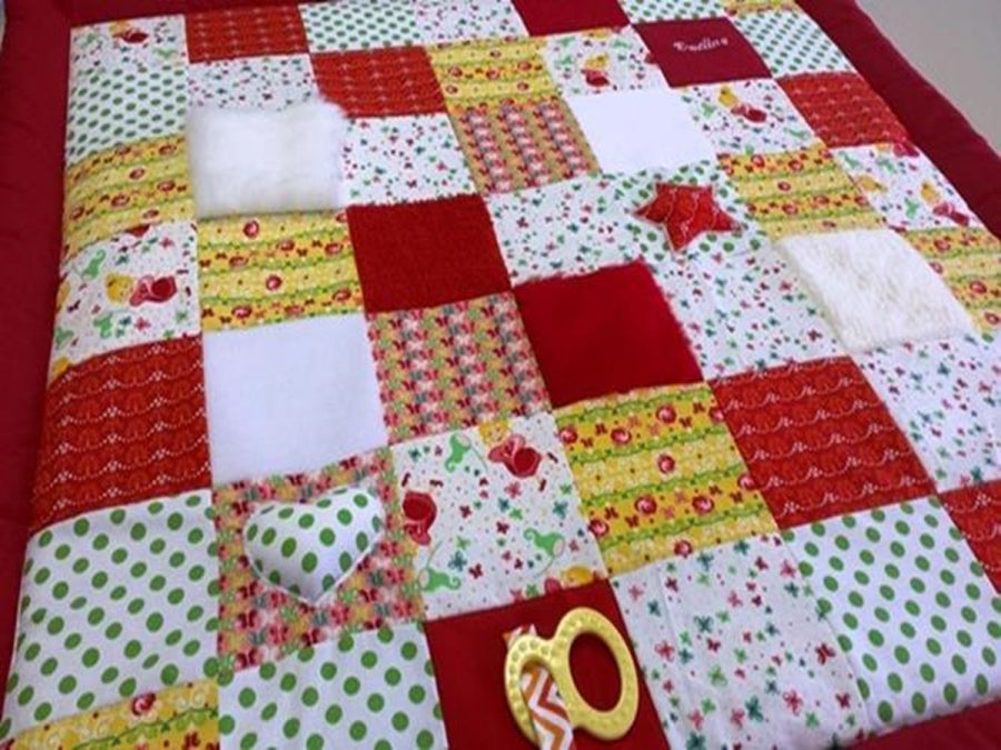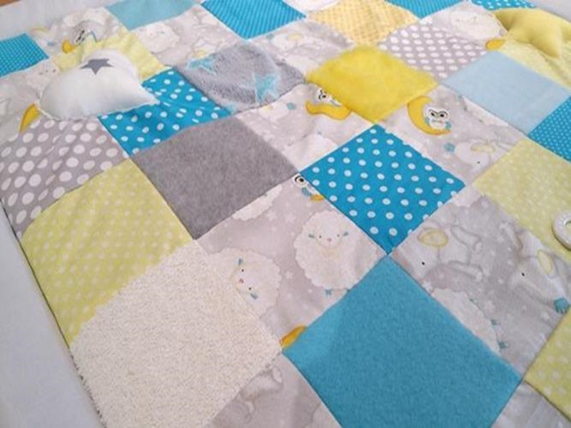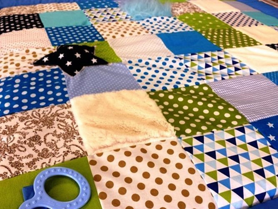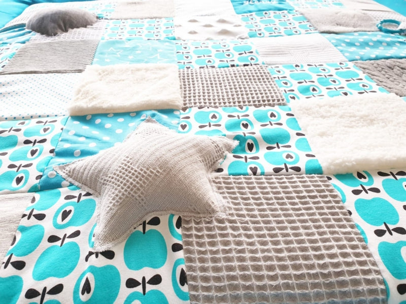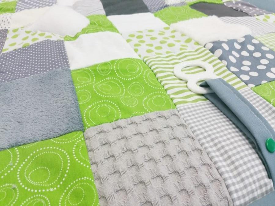 Tessuti diversi Materiali diversi stimolano la sensazione: "Come trapunte patchwork, le trapunte spesso si alternano tra morbide e ruvide". Più tessuti e forme ci sono sulla coperta, più interessante è per le mani. Sono possibili molti tessuti: pelle di jeans di seta pelliccia, tende in tessuto di asciugamano di spugna di velluto. Con fiocchi, nastri, code di mussola, cinghie, cerniere, pannelli a specchio, fibbie e pomelli, la coperta incoraggia le capacità motorie proprio come nei bambini piccoli.