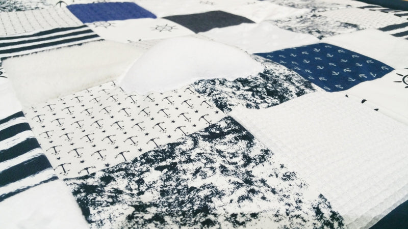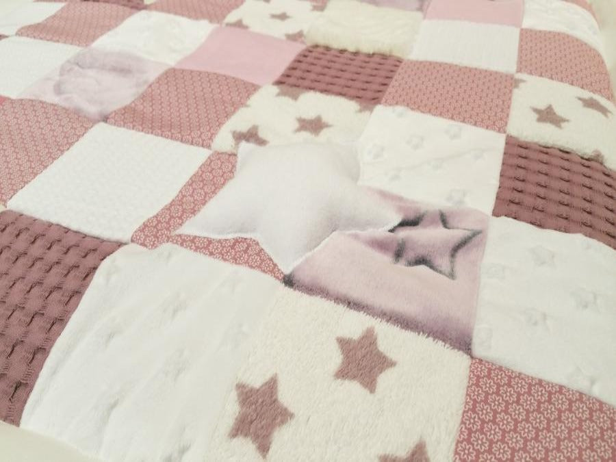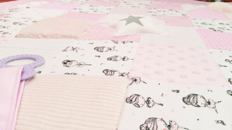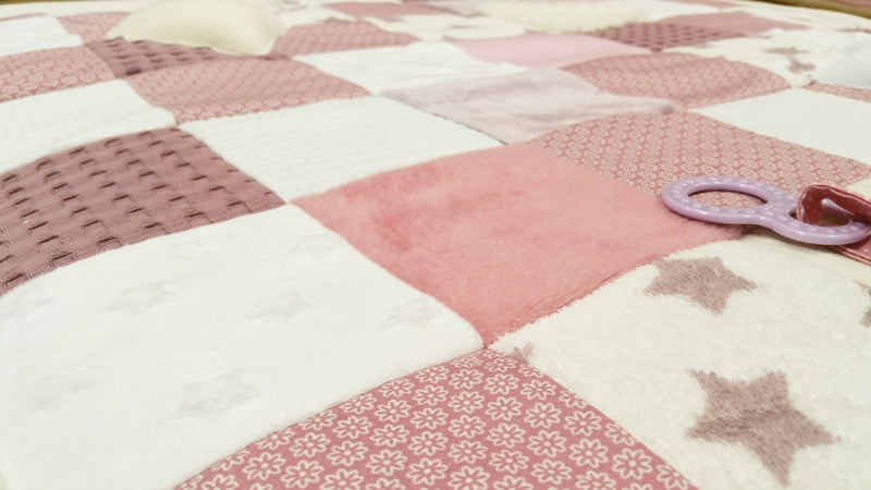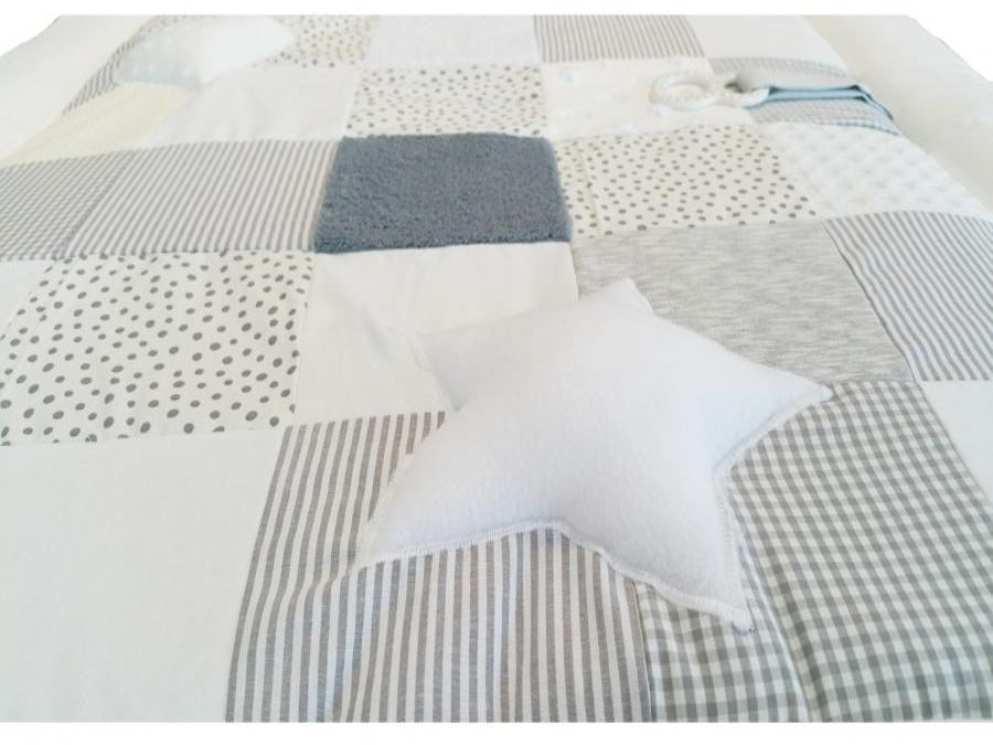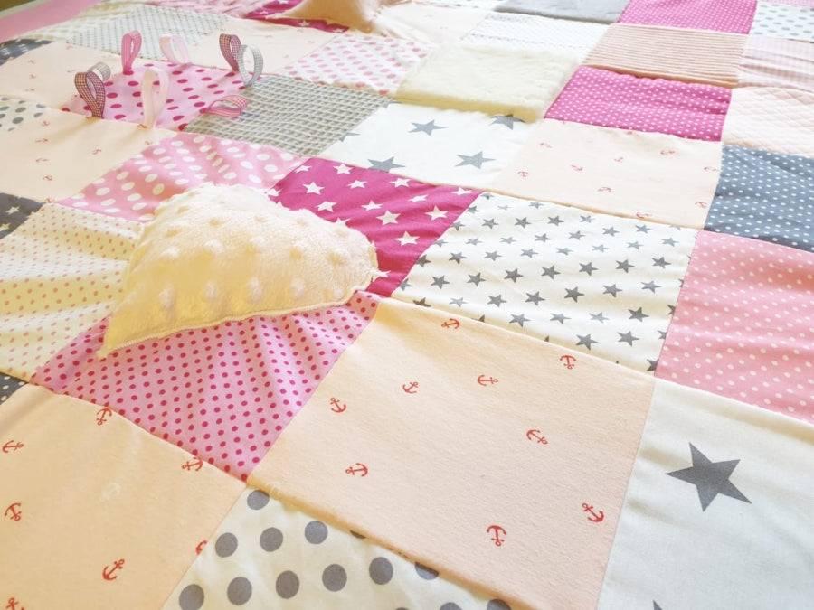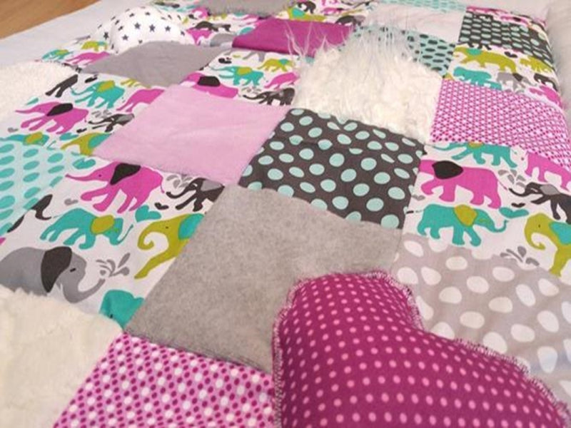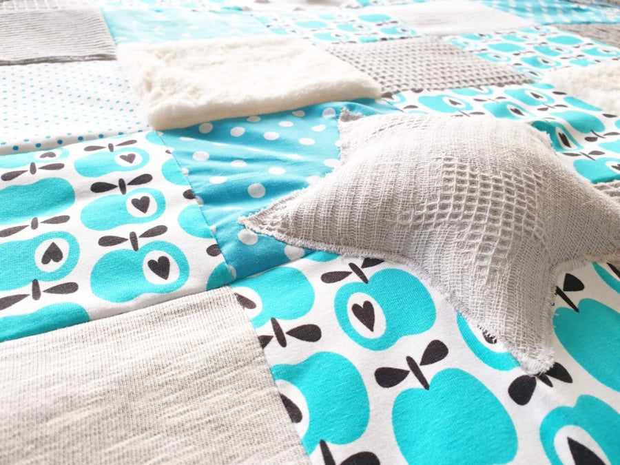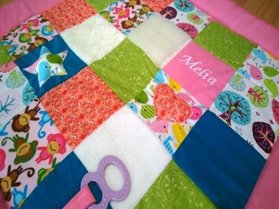 Tessuti diversi Materiali diversi stimolano la sensazione: "Come trapunte patchwork, le trapunte spesso si alternano tra morbide e ruvide". Più tessuti e forme ci sono sulla coperta, più interessante è per le mani. Sono possibili molti tessuti: pelle di jeans di seta pelliccia, tende in tessuto di asciugamano di spugna di velluto. Con fiocchi, nastri, code di mussola, cinghie, cerniere, pannelli a specchio, fibbie e pomelli, la coperta incoraggia le capacità motorie proprio come nei bambini piccoli.